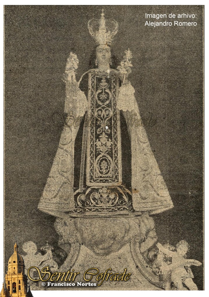 Esta imagen lejos de pensar que desapareció o que fue destruida, ni ha desaparecido ni ha sido destruida. A día de hoy recibe culto en la Parroquia de la Sagrada Familia de la Arboleja – la Albatalía, a tan solo 3km de su enclave original, apartada de lo que un día fue, apartada de su Barrio, sin duda, por voluntad de terceros. Pero antes sigamos con su interesante historia. ¿Por que estaba allí en la Portería? ¿Que necesidad había de tener dos imágenes similares en la misma iglesia? Pues bien, no es raro que en gran parte del Levante español tengamos dos imágenes de la misma advocación en un mismo templo y de similares características, que en este caso como vemos (aunque ambas imágenes, la de la Portería y la Titular del templo, tenían camareras distintas) lucían los mismos hábitos y mantos en ocasiones especiales. Cabe destacar que aun habiendo dos imágenes similares de la Virgen del Carmen, siempre prevalecía la importancia de la Titular, siendo la imagen principal. Era la imagen de la Portería ante la que el Barrio y todos los devotos del Carmelo acudían en masas durante el devoto novenario en las vísperas del 16 de Julio. Tal era la aglomeración que las puertas llegaron a estar vigiladas por la guardia municipal, con el fin de que los fieles entraran en orden, y en periodos de 20 minutos abandonaran la capilla y otro gran grupo volviera ocuparla para el rezo de la Novena, la letanía y salve con la que se termina, como así lo afirma Fuentes y Ponte.