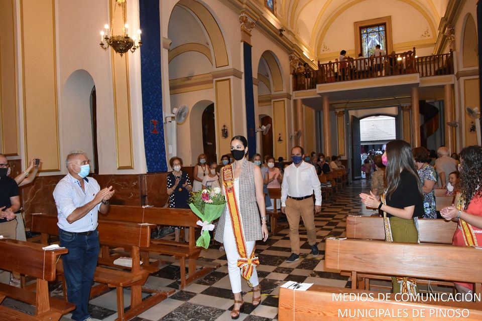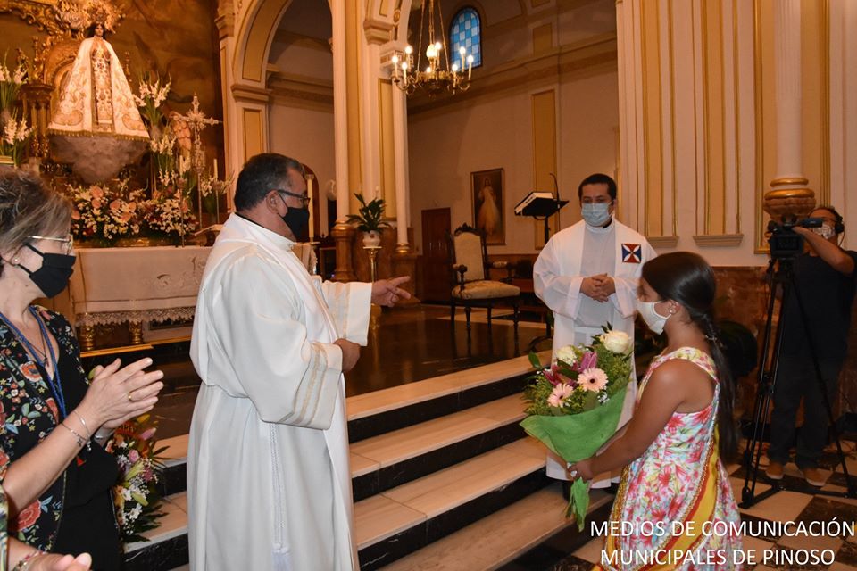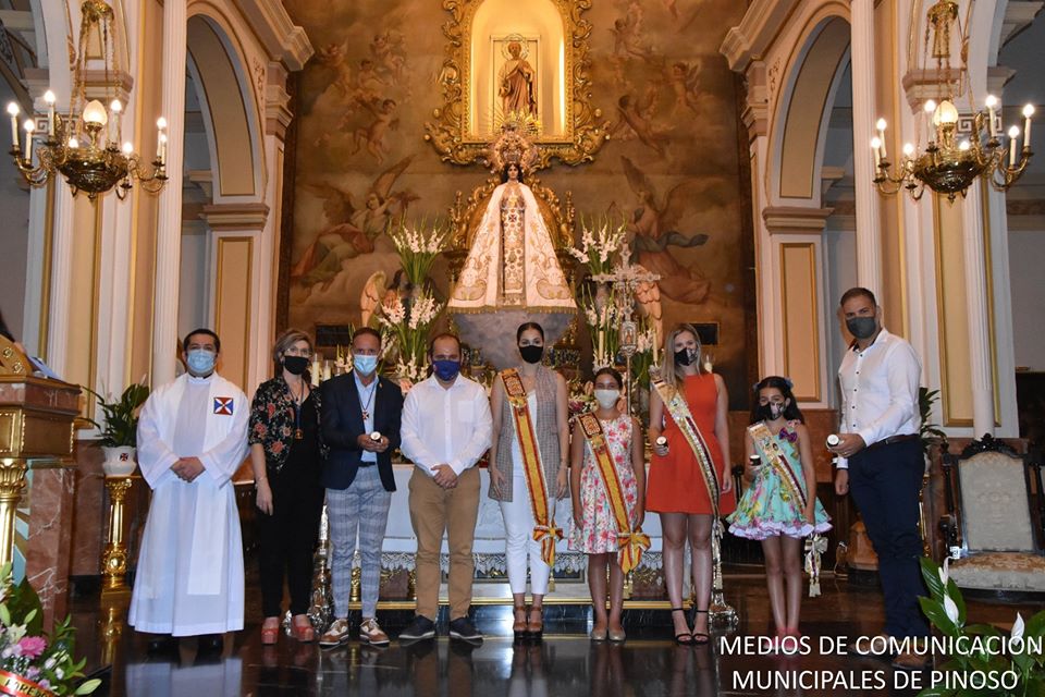 Las Reinas 2019, que prolongan su nombramiento en este 2020, han acudido a la cita junto al Presidente de la Federación, Juan Pablo Hernández. Las señoritas Isabel López Belmonte, Reina mayor, y Candela Sánchez Sánchez, Reina infantil. ofrendaron sus flores a la Madre de Pinoso, quienes aún llevando su mascarilla rebosaban belleza murciana a su paso.