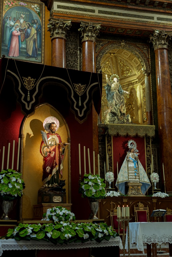 San Bartolomé y la Virgen del Buen Suceso Coronada juntos bajo las naves basilicales.