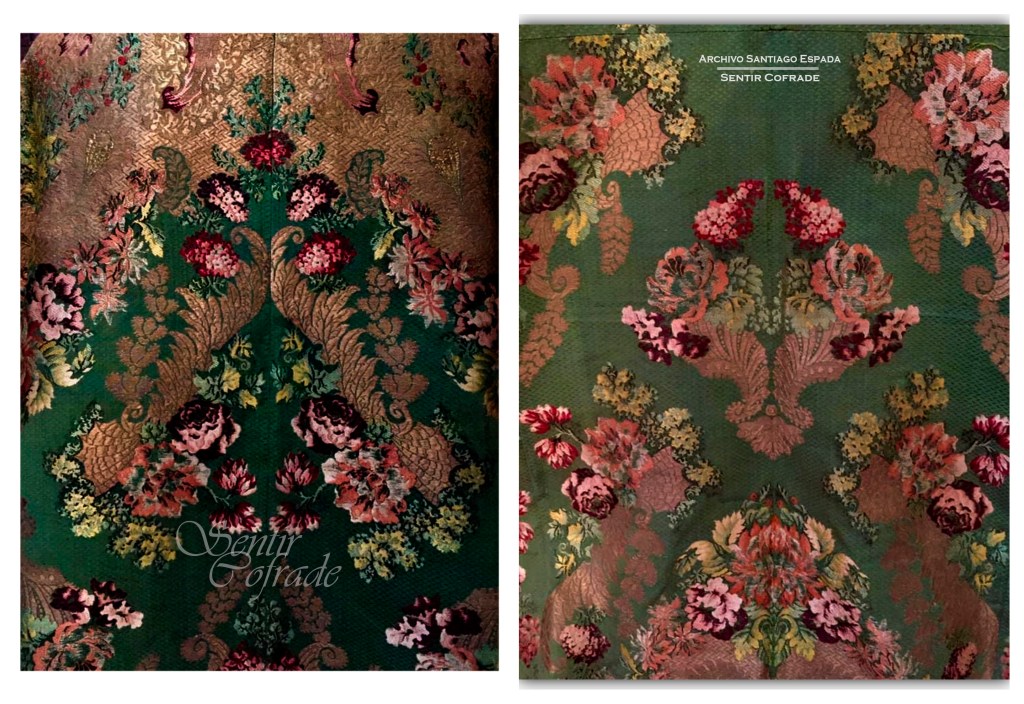 Aunque el tejido con el que se confeccionó este vestido de Nuestra Señora se trata de un tejido lionés, ciertamente frente a estos y con respecto a la excelencia de los tejidos murcianos decían los más entusiastas que los viajantes de Lyon de Francia no hacen nada en esta ciudad, en donde todos se surten de lo que aquí se fabrica y no es la moda lo que hace preferir los tejidos de esta fábrica sino la equidad del precio al paso que compiten con los de Lyon.