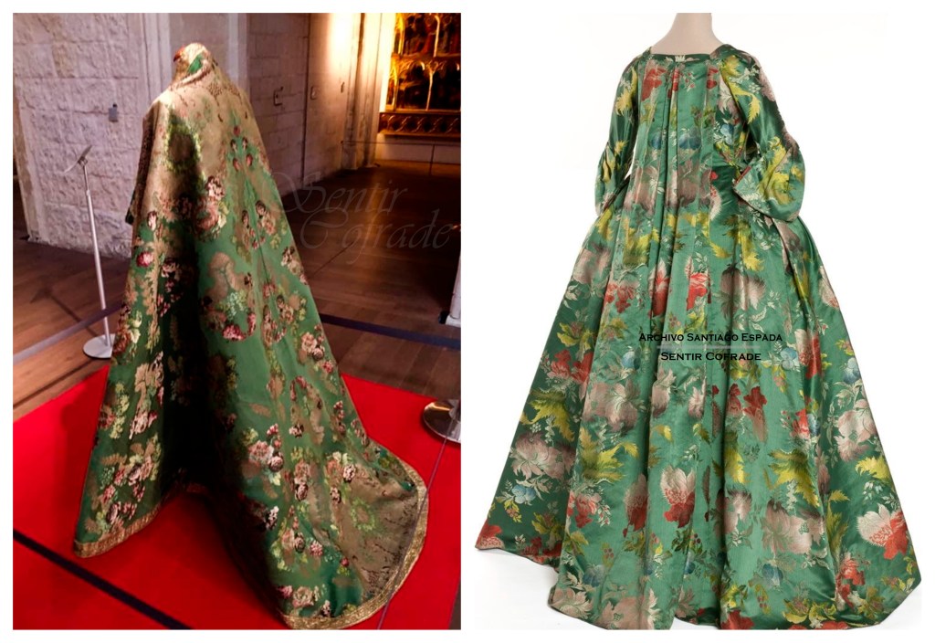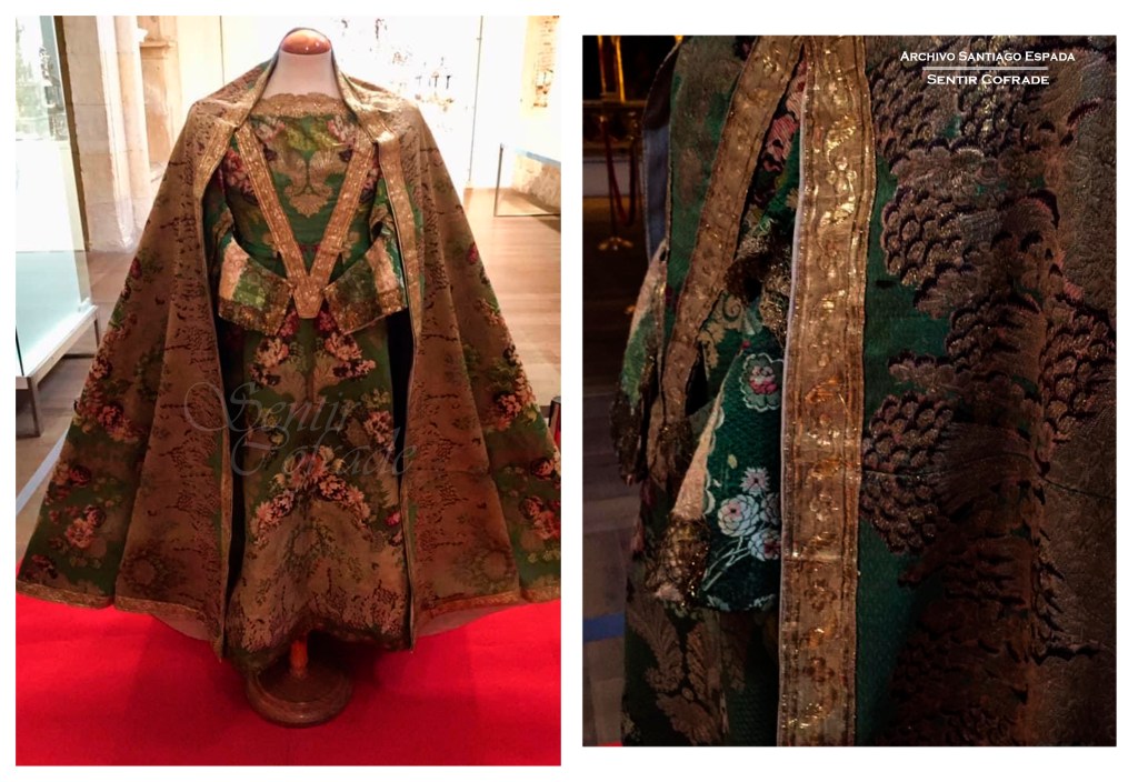 Se trata de un traje confeccionado a partir de un tejido de seda labrado y manufacturado muy seguramente en los talleres de Lyon, cuya decoración responde a un diseño de estilo rococó protagonizado por una floración dieciochesca de exuberante y abigarrado naturalismo, muy cercano al estilo de Jean Revel, que han sido materializado mediante la combinación de hilos de oro e hilos de seda, dando lugar a primorosos contrastes lumínicos. La selección de este tejido y los motivos florales y vegetales que protagonizan su diseño no fue algo casual, sino que estaba plenamente justificado al responder a toda una suerte de simbolismo religioso y mariano. El traje está formado por jubón, con mangas y manguitos separados para facilitar la tarea de vestir la imagen, falda, manto y vestido para el Niño. Todo el vestido está guarnecido con galones de oro entrefino que costaron 363 reales, siendo el importe de su costura 92 reales.