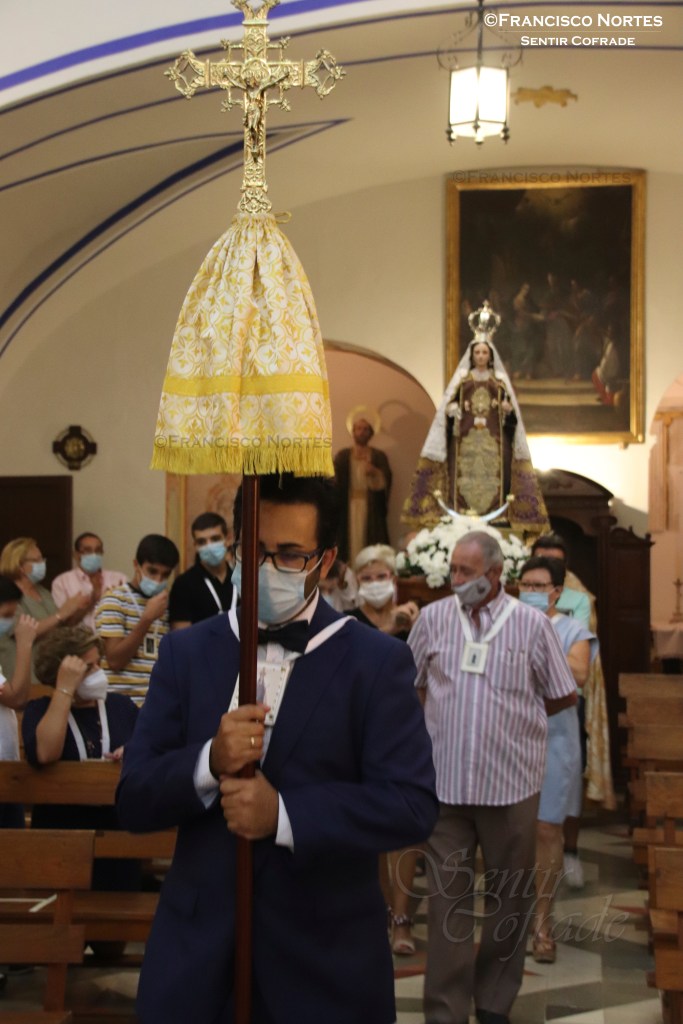 Al concluir la Santa Misa la Cruz alzada precedía el pequeño cortejo, seguido por el paso con la imagen vicaria de la Patrona, luciendo el manto morado con motivo de la rogativa y cerrando el Santísimo Sacramento portado por el Párroco de Santo Domingo. Entre el incesante volteo de campanas, la pólvora que estallaba en el aire, se bendijo a Mula y al mundo entero desde tres puntos diferentes del atrio de la ermita. A su regreso a la misma el aplauso y los vivas dieron paso al canto de la Salve ante la Patrona de Mula, esperando volver a la tan ansiada normalidad que todos necesitamos.