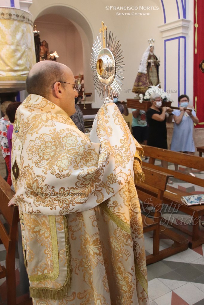 Con manto morado y acompañando a Jesús Sacramentado, la imagen vicaria de la Patrona salió al atrio de su Ermita