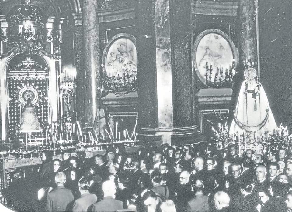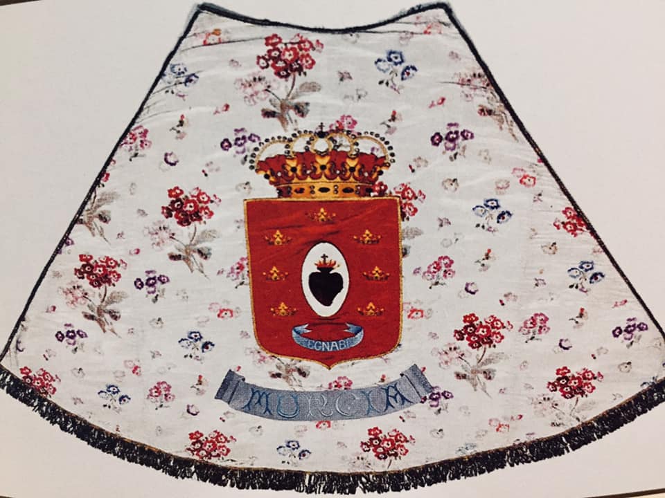 La Patrona de Murcia junto a la del Pilar el 18 de Septiembre de 1940Manto confeccionado en el taller de Pilar Primo de Rivera de Lorca en 1958. Terciopelo bordado en oro y sedas, con medallón central de la Patrona de Murcia, la Virgen de la Fuensanta