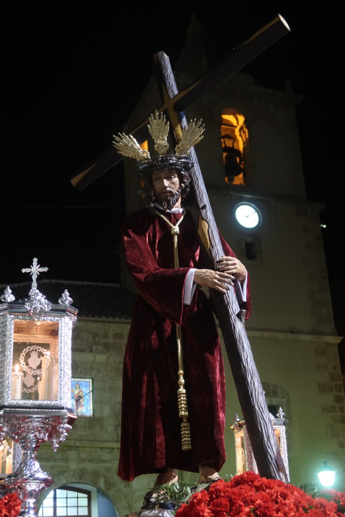 Iconográficamente representa el momento en que Cristo acepta la Cruz y la abraza, instantes previos a comenzar su camino hacia el Gólgota. La Cruz del martirio es abrazada por el stipes, dejando el patibulum en la parte superior del conjunto escultórico, inspirado en las representaciones que comúnmente, se empleaban para representar la figura del Nazareno durante el renacimiento.