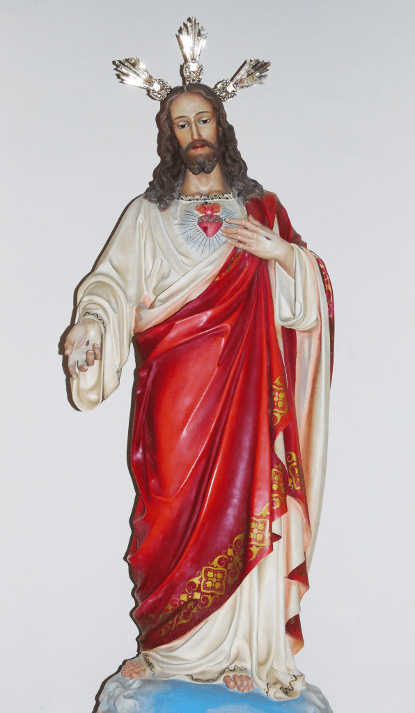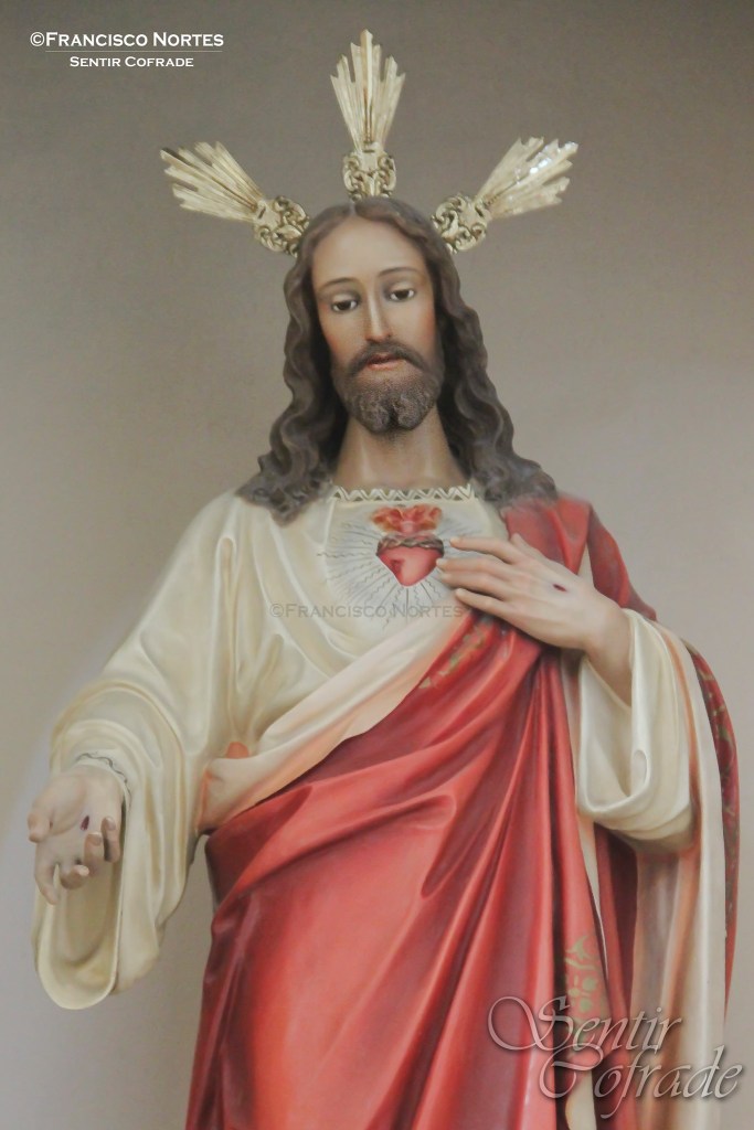 Sin embargo, la devoción de los más mayores hacia el Sagrado Corazón de Jesús no se limita a estas dos imágenes que, desde la altura y durante 75 años, han velado y bendecido a todo un pueblo día y noche. Si nos remontamos un poco más en el tiempo, en marzo de 1941, proveniente de los talleres de Olot, llega a la citada parroquia una talla que, a petición del párroco, es sufragada por la presidenta de las señoras de Acción Católica (Jesusa López Giménez) y que desde entonces se sitúa en la capilla que queda a la izquierda del presbiterio.