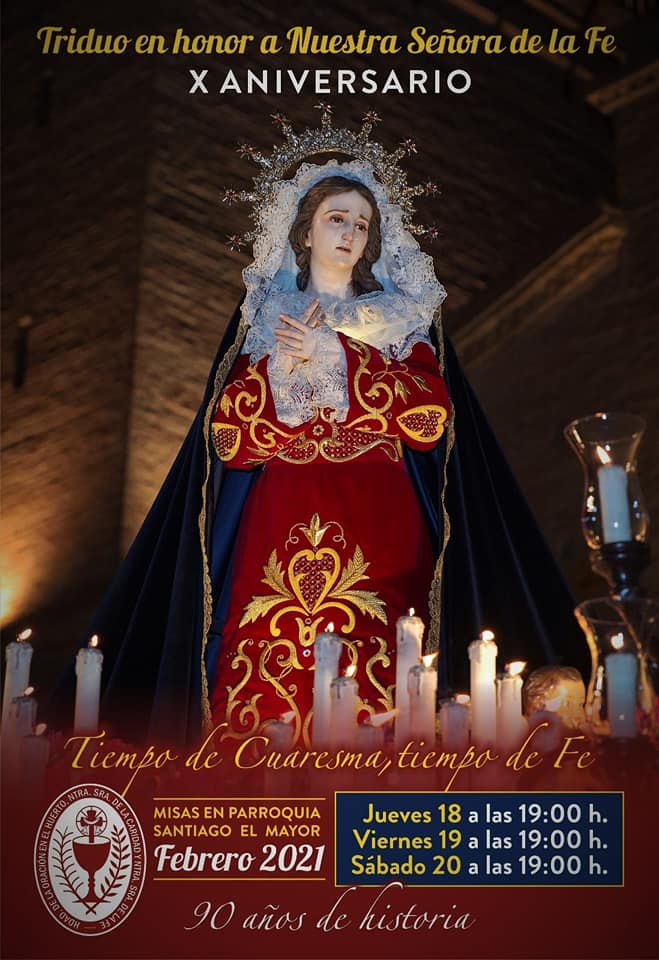 La Hermandad de la Oración en el Huerto está de celebración. Este año tiene lugar el noventa aniversario de la fundación y a su vez el décimo de la llegada de Ntra. Sra. de la Fe, obra del ciezano Yuste Navarro. Para ello celebrarán en la Parroquia de Santiago, en Totana, un Triduo los días 18, 19 y 20 de febrero a las 19h con la Sta. Misa