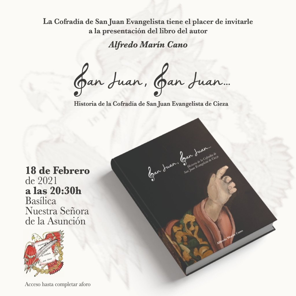 La Cofradía de San Juan presentará esta tarde, en la Basílica de la Asunción, el libro que narra su historia. Esta publicación cuenta con una portada de Mª Victoria Rodríguez y ha sido escrito por Alfredo Marín, en donde narra la historia de la propia Cofradía desde sus inicios hasta la actualidad.