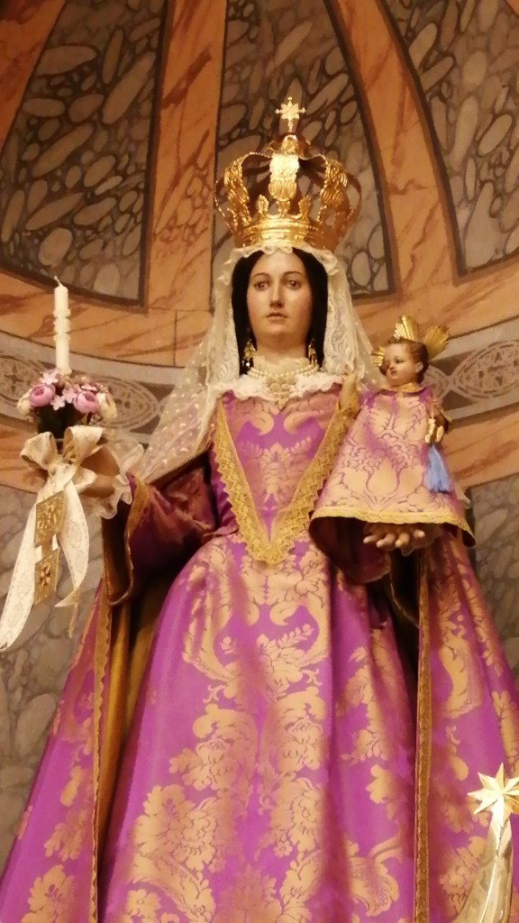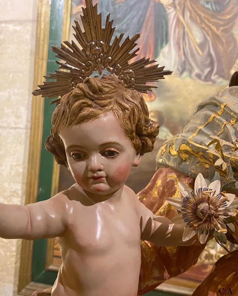 En San Patricio (Lorca), la Virgen de la Aurora luce banderín morado y la imagen del Niño Jesús porta en su mano izquierda la flor de la pasión.