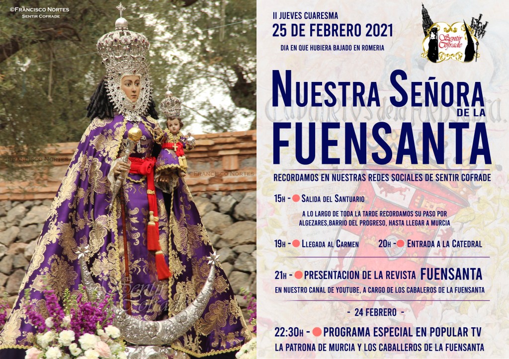 Bien es sabido que antiguamente, durante la Cuaresma, las imágenes se cubrían con velos morados hasta la llegada de la Pascua de Resurrección. Por tanto, la presencia del color morado en sus vestimentas es algo que venía ligado no a la penitencia cuaresmal, sino a los tiempos de rogativas. Tiempos como este que estamos viviendo y que se han venido sucediendo a lo largo de los siglos de historia de la Virgen de la Fuensanta, en los que Ella siempre ha prodigado sus beneficios sobre los murcianos. Acudamos con fe ante su imagen y que el color morado del bellísimo e histórico traje que luce la Santísima Virgen esta Cuaresma, sea una llamada para que no dejemos de pedirle por la salud del mundo.