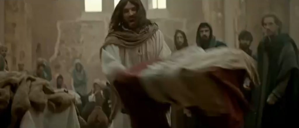 alcanzando el azul cielo, Jesús mira a los fariseos y con dolor pronuncia estas palabras hacia uno de ellos : – ¡Es un templo de oración no una cueva de ladrones! –