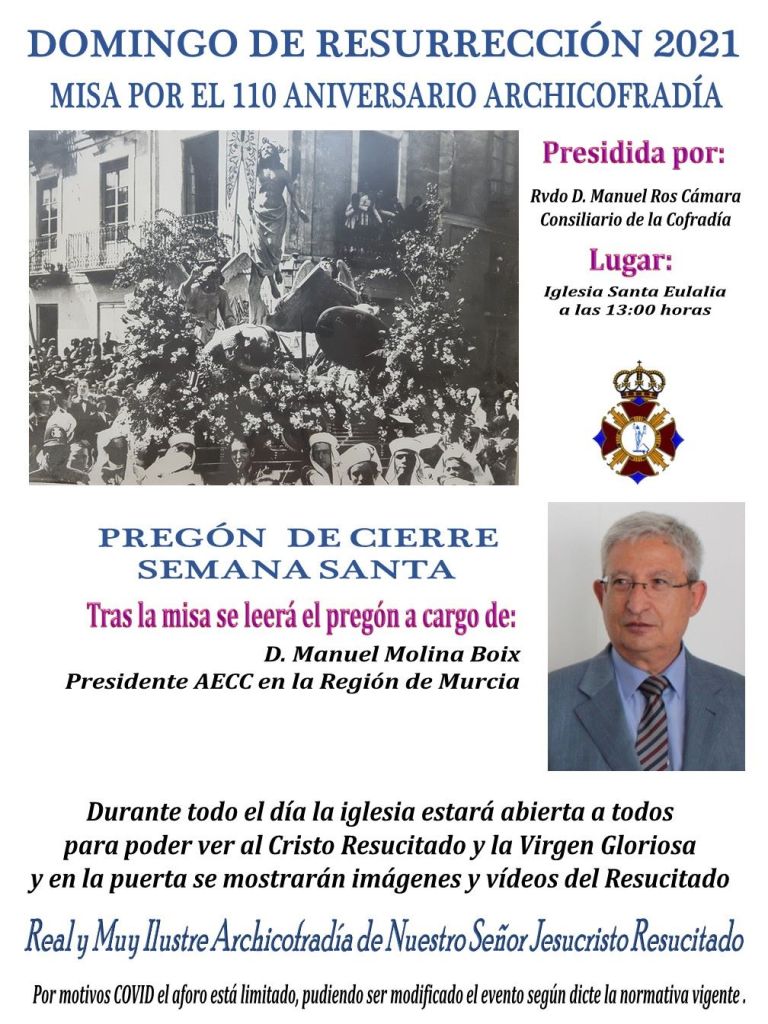 Era uno de los actos por confirmar, la pandemia no podrá con ello. Este 2021 la Semana Santa de Murcia tendrá su tradicional Pregón de Cierre. Será pronunciado por Manuel Molina Boix, Presidente de la AECC en la Región de Murcia.