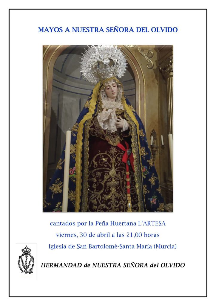 Por su parte, en San Bartolomé, la Hermandad de Nuestra Señora del Olvido también se suma a esta celebración. Será a las 21h con la Peña L´Artesa de Aljucer.