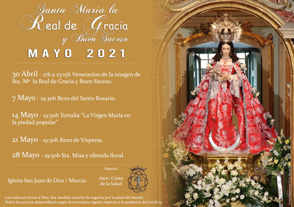 Como lo viene haciendo desde el año 2012, siguiendo el precedente de la Peña de la Pava, la Cofradía de la Salud montará su altar con la Virgen de Gracia en San Juan de Dios. En esta ocasión las visitas a tan histórica imagen se producirán en el interior del templo, en horario de 17h a 23:15h. Una «Noche de los Mayos» diferente a la habitual, pero que de igual modo nos ofrece la posibilidad de cumplir con el rito un año más. Para la ocasión la imagen bajará de su camarín, para permanecer en veneración ante la cercanía de sus hijos. Además la Cofradía de la Salud ha preparado un amplio programa de actos y cultos en honor a su Madre, que se extenderán hasta final de mayo, cada viernes a las 19:30h.