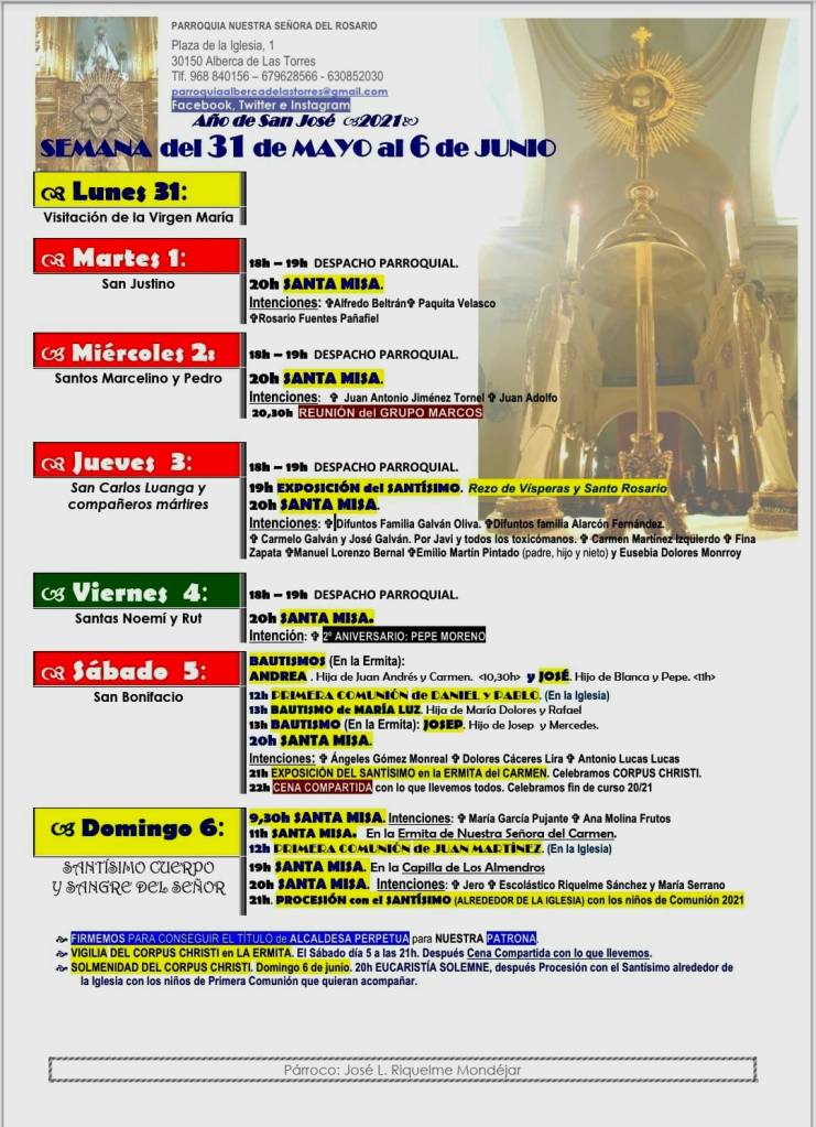 En la pedanía murciana de la Alberca de las Torres, a las 21h, tendrá lugar la procesión al rededor de la Parroquia del Rosario, previa celebración de la Misa a las 20h.