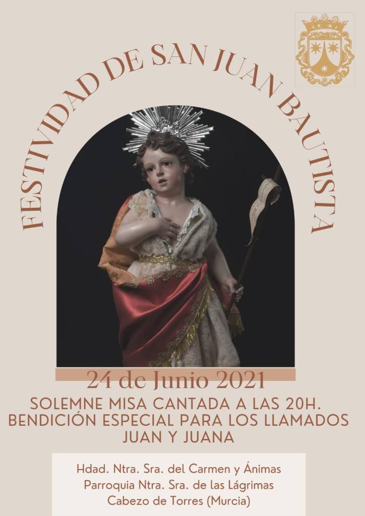 Para esta ocasión, a las 20h, se celebrará la Santa Misa en honor a San Juan Bautista. A su término habrá procesión claustral con la bendita imagen por el interior de la Parroquia de las Lágrimas.