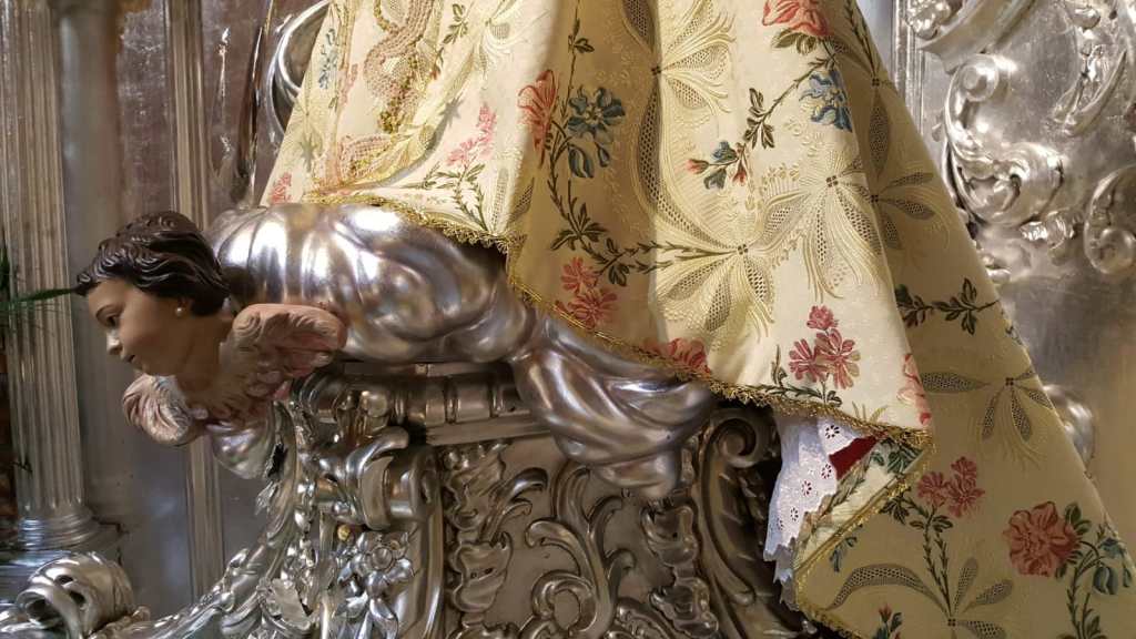 La tela para la confección de este terno, que lucirá en las grandes solemnidades y en sus traslados, ha sido adquirido en la ciudad de Valencia y se trata de un tejido de algodón y seda.