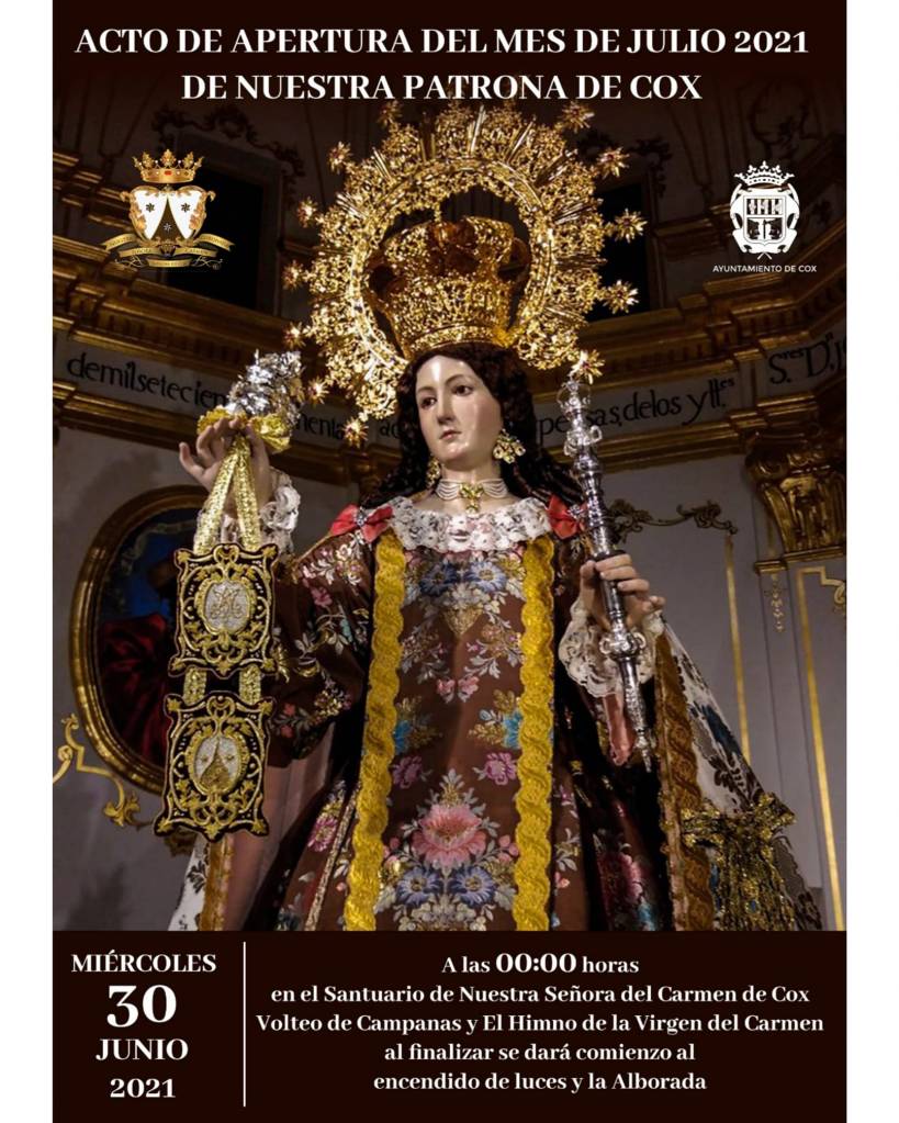 Nuestros vecinos de la Vega Baja, concretamente en Cox, sienten un profundo amor por la Santísima Virgen del Carmen. La Patrona, imagen de Sánchez Lozano, recibe culto en su Santuario y que es centro devocional de los devotos carmelitas. Como inicio de los cultos, en los primeros minutos del mes de julio, la Mayordomía de Nuestra Señora del Carmen, organiza un acto de apertura para el mencionado mes. Este miércoles, a las 00h, habrá volteo de campanas y se cantará el Himno a la Virgen. También, en el inicio de julio, habrá alborada y encendido de luces.