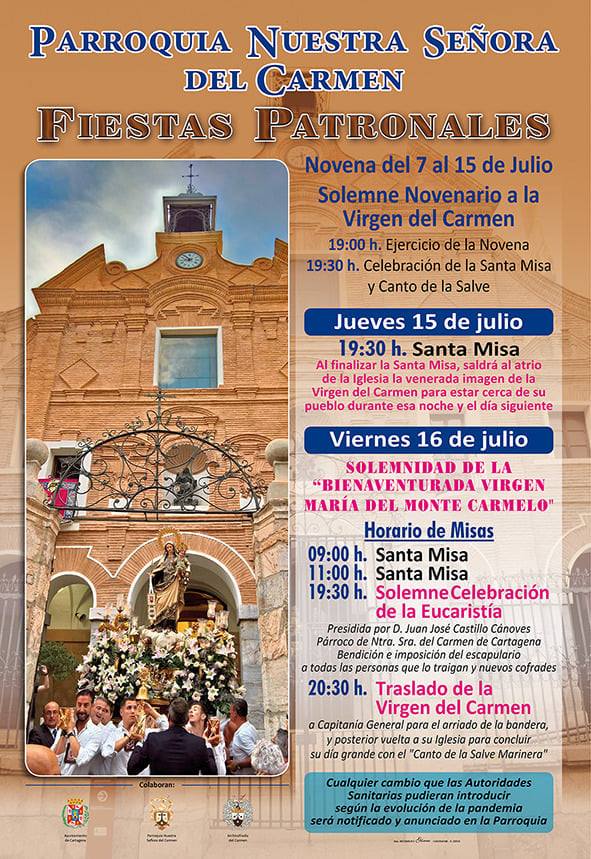 El 16, día de la Virgen del Carmen, habrá celebración de la Santa Misa a las 9h y 11h. Por la tarde de nuevo a las 19:30h la Sagrada Eucaristía. Al término de ésta tendrá lugar el Traslado de la bendita imagen hasta la Capitanía General. Será por tanto la Virgen del Carmen la primera imagen en salir a las calles de Cartagena, después de tanto tiempo de sequía procesionista en el callejero de la ciudad portuaria.