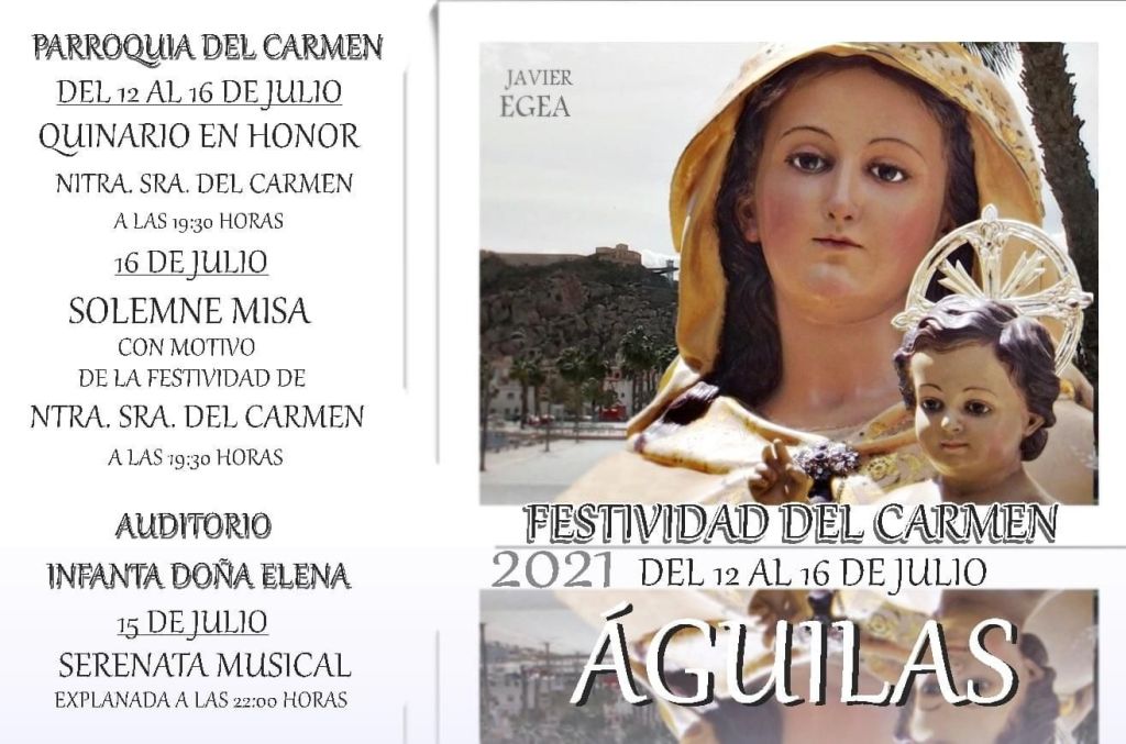 La ciudad de Águilas tiene un profundo amor por la Santísima Virgen, lo hace de un modo muy especial ante su Patrona, la Virgen de los Dolores. Pero llegado el mes de julio, es la Virgen en su advocación del Carmen la que centra todas las miradas del municipio costero.