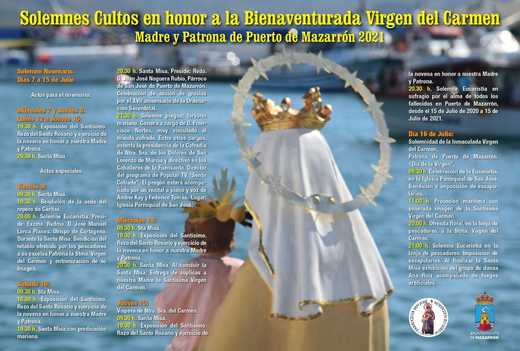 El Solemne Novenario se extenderá hasta el 15 de julio, siendo el viernes 16 el día grande de la Virgen del Carmen. Esa mañana, tras la Santa Misa de las 9:30h, habrá procesión marítima con la bendita imagen, la primera procesión de estas características de nuestra Diócesis después de todo este tiempo.