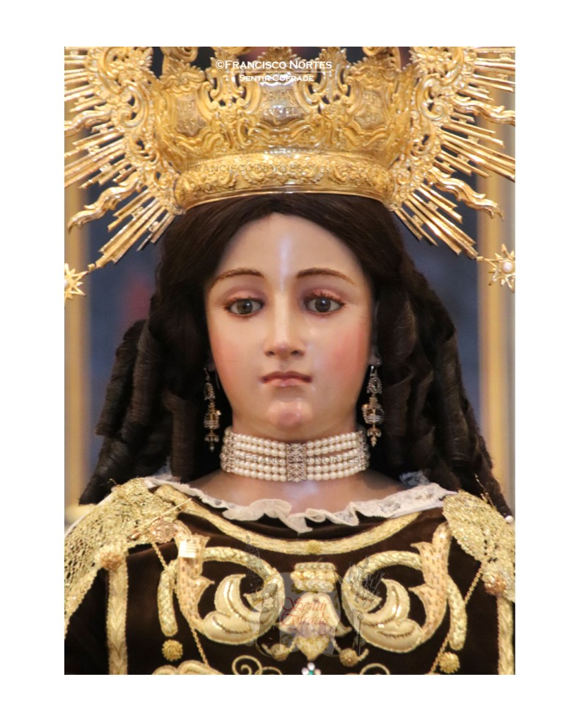 Luce una perfecta cabellera, mimada con celo por el maestro posticero José Fernando Espinosa, quien ostenta tal encargo año tras año. Para la ocasión la Patrona del Barrio del Carmen luce la Corona de la Coronación, así como la medalla de oro de la Archicofradía de la Sangre y la carmelitana Peña del Tablacho.