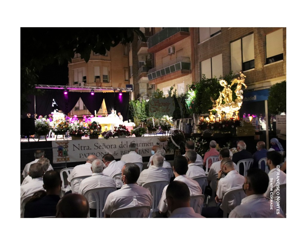 La Santísima Virgen del Carmen, Patrona de Beniaján (Murcia), volvió a salir a la calle después de dos años. La Madre de este huertano pueblo, en las faldas de la sierra, cruzó la puerta principal de la Parroquia de San Juan Bautista para presidir su anual Misa en el día de su Solemnidad. Así, el viernes 16 de julio, Nuestra Señora cruzó la plaza de la iglesia, a hombros de sus portadores, para llegar hasta la calle Mayor. Una vez allí tuvo lugar la Santa Misa en el día del Carmen. A su término, concluida la celebración, de nuevo el trono cruzó la calle para adentrarse en la plaza y entrar en la iglesia.