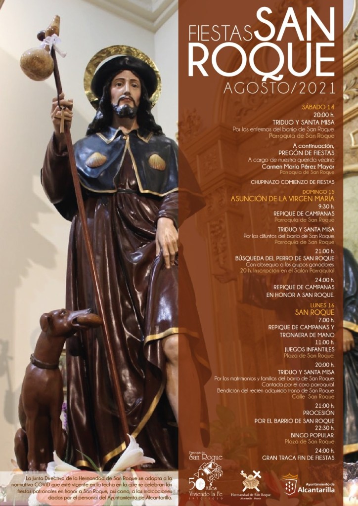 La Parroquia de San Roque celebrará las fiestas a su Patrón a partir del sábado 14 de agosto, concluyendo con la Solemne Procesión del Santo. Será esta la primera procesión ordinaria que la localidad vivirá, tras este año y medio de pandemia. A este Santo, tan relacionado con las epidemias y enfermedades, nos encomendamos por la salud del mundo.