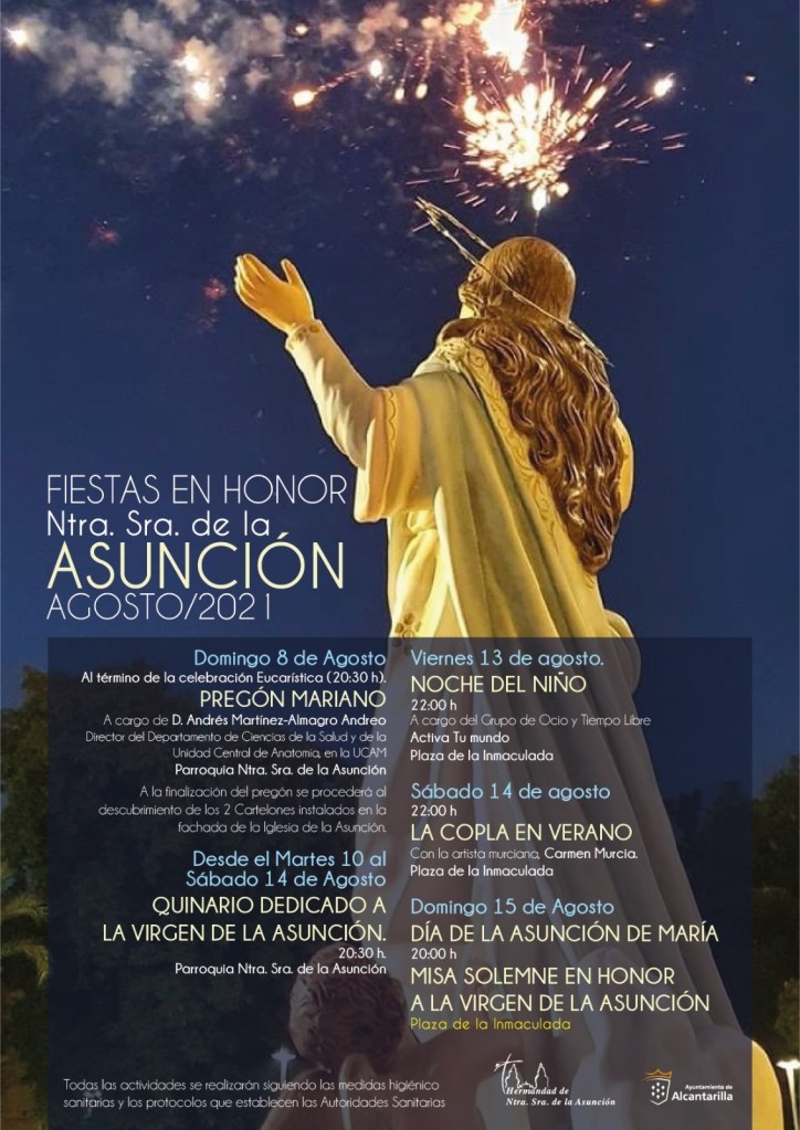 Antes del final de vacaciones de verano Alcantarilla vibra con las Fiestas Patronales de los Barrios de San Roque y Campoamor con la Asunción. Por su parte la Parroquia de la Asunción acogerá los cultos en honor de Ntra. Sra., que darán comienzo el domingo 8 con el pregón. El Quinario en honor a la Virgen y la celebración del día 15 completan el programa, junto a otros actos.