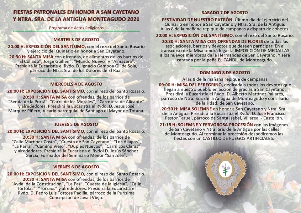 Ayer dieron comienzo los tradicionales cultos en honor a San Cayetano y la Virgen de la Antigua, en la pedanía murciana de Monteagudo. Los Patrones de este histórico rincón de la huerta volverán a salir en procesión este próximo fin de semana. Tras la celebración del Solemne Quinario, que concluye el sábado, el domingo se celebrará la Solemne y Fervorosa Procesión en que ambas imágenes vuelvan a salir a las calles del pueblo a las 21:15h.