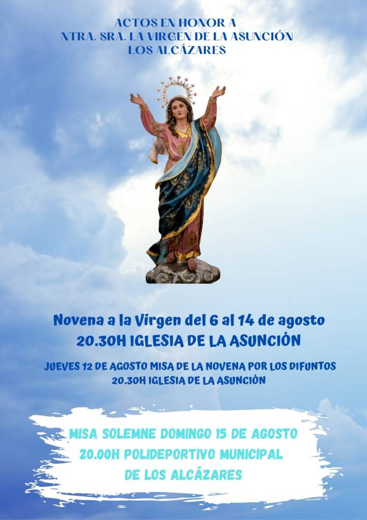 La querida imagen de la Virgen de la Asunción, obra de Sánchez Lozano, presidirá sus anuales cultos y lo hará por segundo año consecutivo sin procesión. El viernes 6 de agosto dará comienzo el Solemne Novenario en su honor, concluyendo en la víspera de la Asunción el día 14. Todos los días será a las 20:30h. El jueves 12 las intenciones de la Santa Misa serán por el eterno descanso de los fallecidos. El día de la Virgen, 15 de agosto, la celebración será en el polideportivo municipal a las 20h.