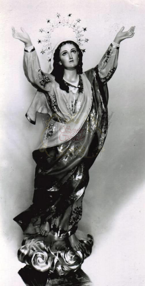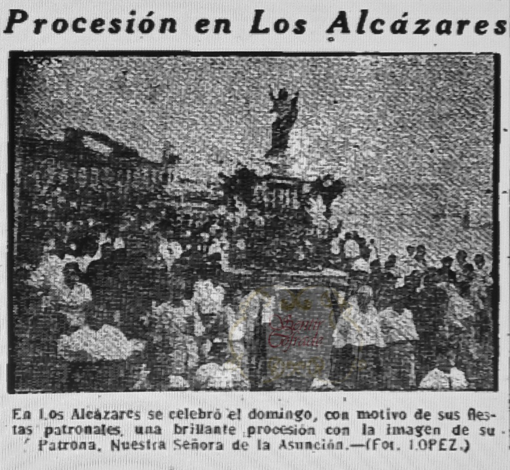 Sin menospreciar el resto de imágenes, me atrevería a decir que una de las piezas marianas bajo dicha advocación más sobresalientes fue la realizada para la localidad costera de Los Alcázares poco tiempo después de la proclamación del Dogma de la Asunción. La imagen de Sánchez Lozano, datada en 1954 (no en 1951 como suele ir difundiéndose); sustituyó a la destruida en el fatídico verano del año 1936, encargada por el cura-párroco de Roda (pedanía de San Javier, municipio al que perteneció parte del término municipal de Los Alcázares hasta su segregación del mismo el 13 de octubre de 1983) al escultor murciano Francisco Sánchez Araciel hacia 1905. La fiesta de la Mar tuvo como foco de religiosidad a la efigie de la Patrona alcazareña al llegar el mes de agosto, celebrándose una serie de costumbres en los días previos al día de la Virgen como el retiro de los huertanos a playas marmenorenses como Los Alcázares, tradición que cada año vivimos los veraneantes al verlos montados en las carretas cruzando el centro urbano después de un largo viaje que iniciaron en la capital; además del rito de los baños nocturnos o “Novenarios”, vinculado a dicho retiro huertano a la ribera del Mar Menor coincidiendo con el ciclo lunar. Incluso los huertanos, junto a los pescadores de la población, serían los impulsores de la procesión marítimo-terrestre que conocemos hoy en día, pidiendo permiso al sacerdote para poder desfilar con la imagen de la Virgen que hicieran los Aracieles (recordemos que Francisco Sánchez Araciel no trabajó solo, sus hermanos Manuel y Cecilia colaboraban en el taller familiar) tanto por tierra como por las aguas del Mar Menor a bordo de una embarcación pesquera. La celebración de los festejos en honor a la Virgen de la Asunción, Patrona de Los Alcázares, fueron suspendidos entre 1936 y 1939 debido a la Guerra Civil; aunque en el último año citado no se celebró procesión al haber desaparecido la preciosa talla de los Aracieles en la quema de iglesias acaecida en agosto del 36.