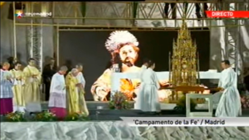 La participación de Murcia con la Santa Cena no se limitó al Vía Crucis, pues una imagen captada por el gran Joaquín Zamora, estuvo proyectada en una gran pantalla, en el llamado «Campamento de la FE» en Cuatro Vientos. El Señor y San Juan, recostado en el regazo de Cristo, fueron testigos de aquellos intensos instantes en que hasta llovió. Sin duda uno de los momentos más emotivos fue la exposición del Santísimo Sacramento en la Custodia procesional de Toledo, tal y como vemos en la imagen de TeleMadrid.