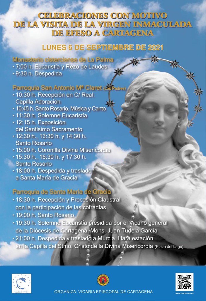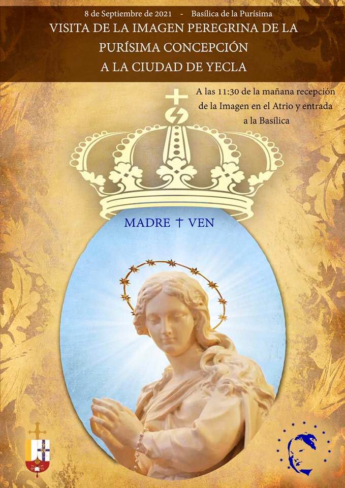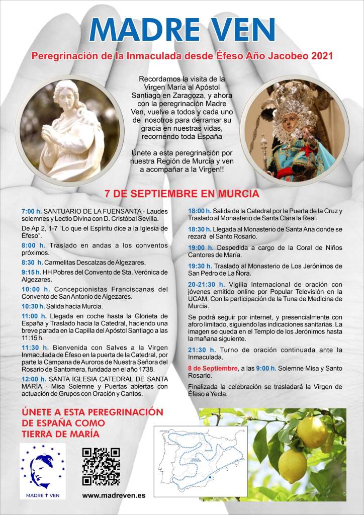 Con motivo del Año Xacobeo la imagen de la Inmaculada Concepción está recorriendo España. El 6 de septiembre llegará a Cartagena, pasando por Murcia el 7 y finaliznado su estancia en nuestra Región el 8 en Yecla. Llegados estos días se han programado Vigilias de Oración, traslados y procesiones, entre otros actos de culto ante la imagen de la Inmaculada.