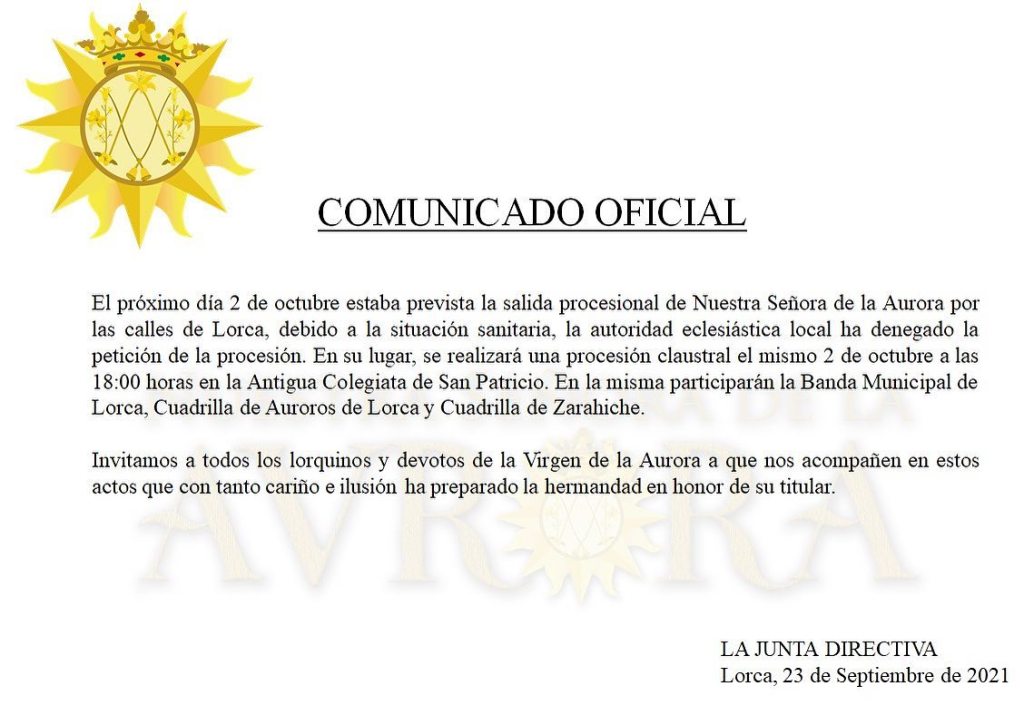 El pasado 14 de septiembre la Hermandad de la Aurora hacía público su programa de actos y cultos, poniendo final a todos ellos con la Solemne Procesión con la Virgen por las calles de Lorca. Finalmente no será así. Esta misma mañana la propia Hermandad hacía público un comunicado en el que indicaba que «la autoridad eclesiástica local ha denegado la petición de la procesión»