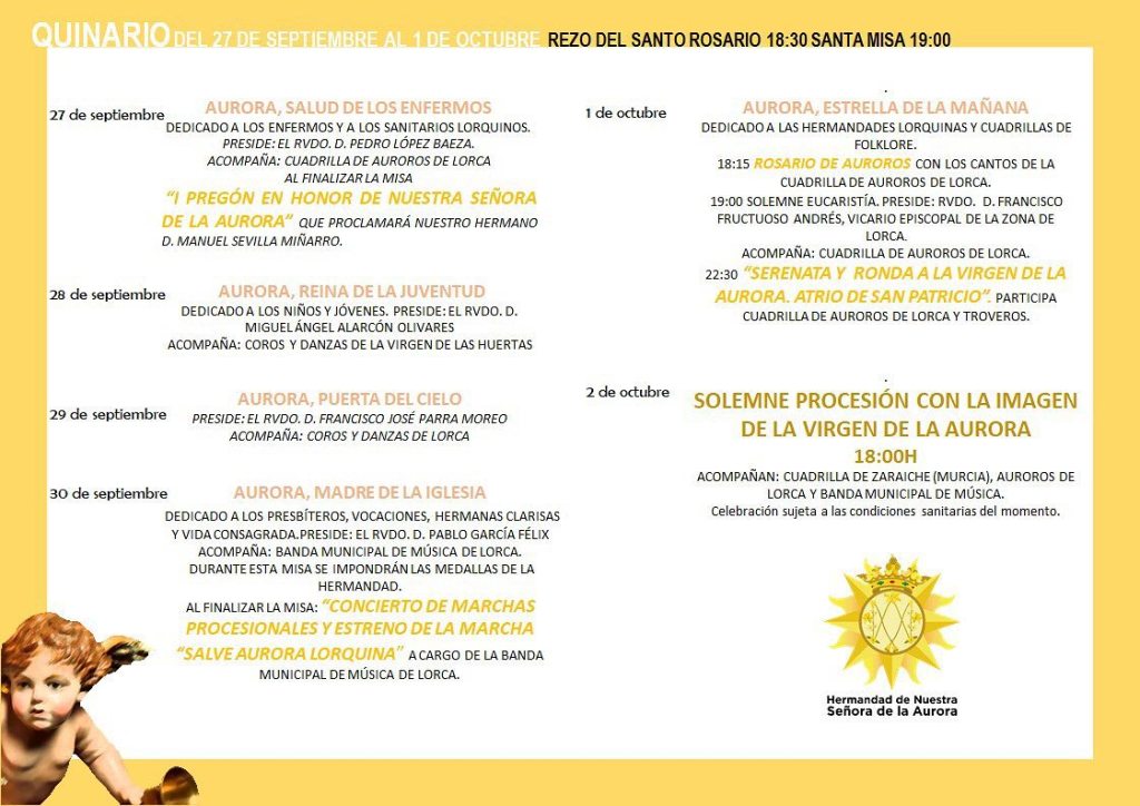 De igual modo la Hermandad de la Aurora mantiene el resto de la programación prevista, la cual se desarrollará en la antigua Colegiata de San Patricio, en donde tienen su sede y donde recibe culto tan bella imagen de Nuestra Señora.
