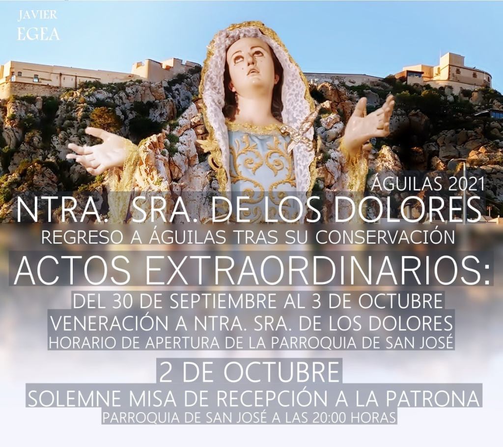 Ntra. Sra. de los Dolores ha regresado a su ciudad de Águilas, concretamente al templo de San José donde es custodiada. El pasado 8 de abril, la imagen abandonaba la localidad de donde es Patrona, para ser trasladada al Centro de Restauración y Conservación de la Región de Murcia. Durante este tiempo ha sido sometida a una intervención de conservación de la talla, en la que tras ser evaluada, se puede destacar su buen estado de conservación, por ello no ha sido necesario su proceso de restauración.
