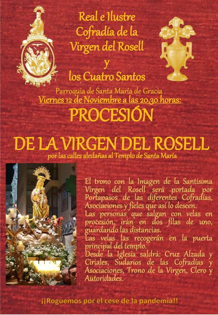 La Real e Ilustre Cofradía de la Virgen del Rosell y los Cuatro Santos, de la Parroquia de Santa María de Gracia (Cartagena), ha programado los cultos en honor de sus Titulares. El solemnes triduo, la función del Voto y la procesión de la Virgen, componen el citado programa de cultos.