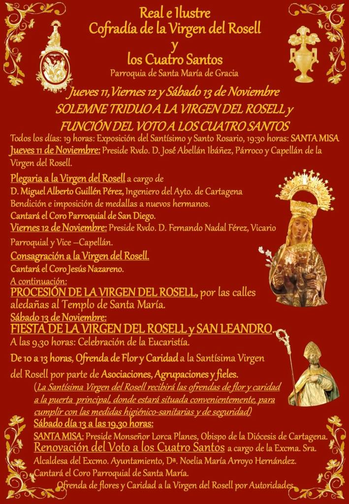 El triduo se realizará del jueves 11 de noviembre al sábado 13, dando comienzo los cultos a las 19h. El viernes 12, a las 20:30h, tendrá lugar la Solemne Procesión con la imagen de la Virgen del Rosell. La Alcaldesa de Cartagena, Noelia Arroyo, renovará el Voto de la Ciudad a los Cuatro Santos.