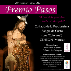 El sábado 13 de noviembre la Asociación Mujeres cofrades de Cartagena celebrará los actos de entrega del Premio PASOS 2021 ala Cofradía de la Preciosísima Sangre de Cristo, “los coloraos”, de Cehegín (Murcia), ganadora de la XVI Edición de este galardón en pro de la igualdad entre cofrades.