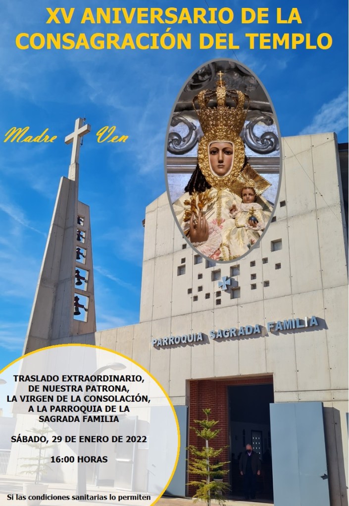 Ntra. Sra. de la Consolación volverá a salir a las calles de Molina de Segura. Lo hará este mes de enero con motivo del XV aniversario de la consagración de la Parroquia de la Sagrada Familia. Será el sábado 29 de enero, a las 16h, cuando la Patrona sea trasladada hasta la mencionada feligresía. Una vez allí, tras la celebración, permanecerá unos días en la Parroquia. Todo ello se llevará a cabo siempre y cuando la situación actual lo permita, según anuncian desde la organización.
