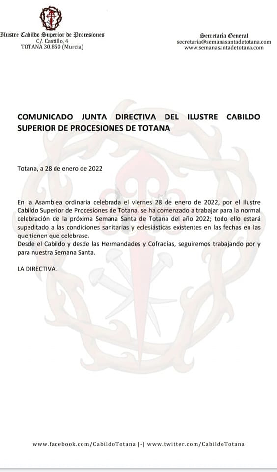 En el mismo se anuncia que, tras la Asamblea del 28 de enero del presente 2022: «se ha comenzado a trabajar para la normal celebración de la próxima Semana Santa de Totana del año 2022«. Como era de esperar dicha celebración queda sujeta a la evolución de la actual situación.