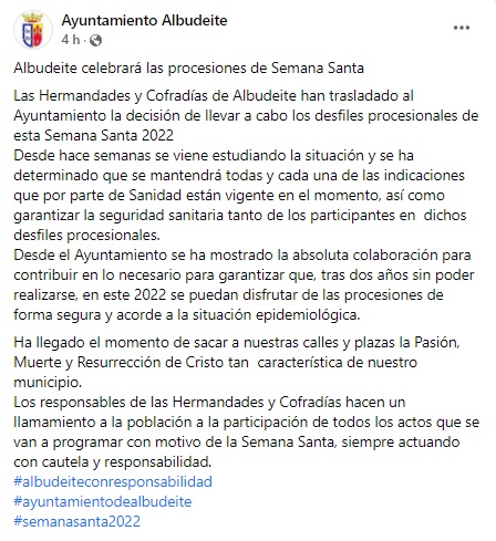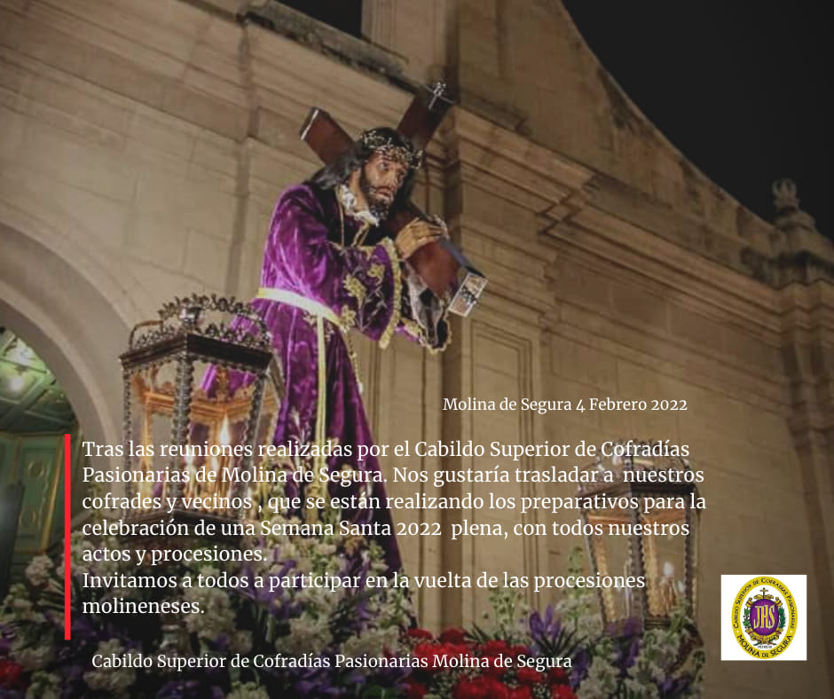 Con Albudeite, Calasparra y Molina de Segura son ya un total de nueve municipios los que han hecho público, de forma oficial, que habrá procesiones en las calles para Semana Santa. Ayuntamiento y Cabildos, respectivamente, han anunciado la decisión. De hecho la propia Calasparra ha presentado incluso su cartel de Semana Santa, protagonizado por un primer plano del Cristo de la Sangre.