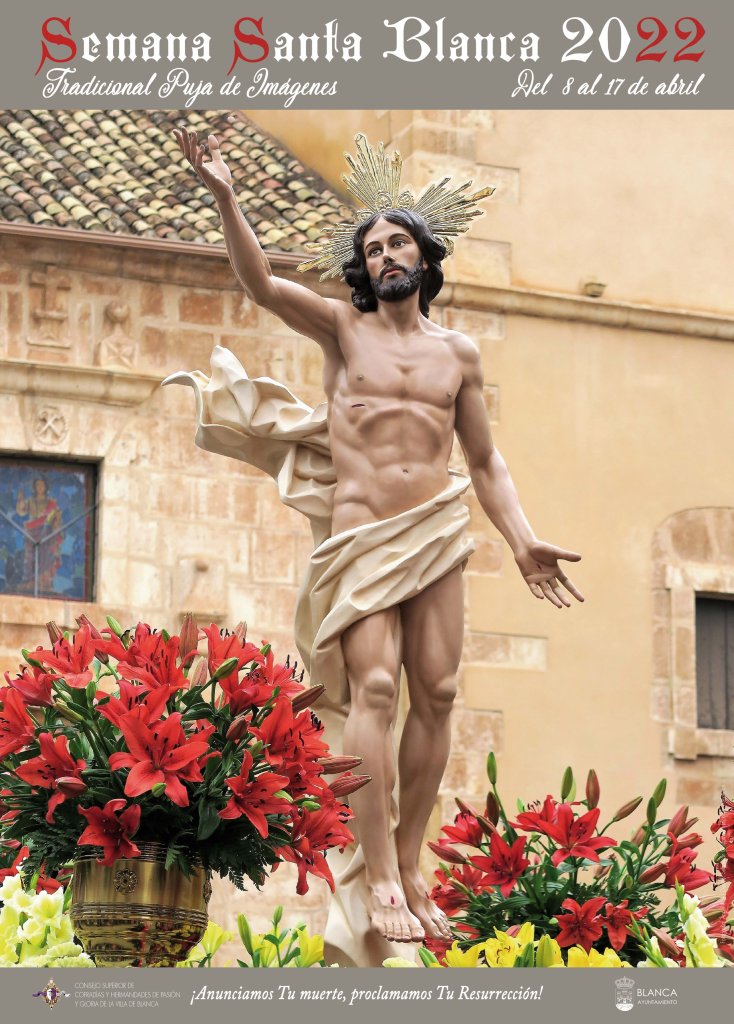 Son 9 procesiones en las que Blanca narra paso a paso la Pasión, muerte y resurrección de Cristo hecha madera por imagineros como Hernández Navarro, padrino de Sentir Cofrade, Sánchez Tapia, continuador de la escuela del inmortal Salzillo, el madrileño Tomás Parés, Ponsoda y Bravo, Miguel Cordero, Sánchez Lozano, García Mengual, Enrique Calero, Yuste Navarro, Carmen Carrillo y el escultor blanqueño Molina Palazón. Hermosas obras todas ellas que dejan la impronta de la belleza hecha arte y que llevan al espectador que se acerca a contemplarlas, ese nazareno sin túnica, a la meditación y a la oración. Jesús Resucitado, de la Hermandad de San Juan Evangelista, primera obra exenta de Hernández Navarro en 1986, en su primera época como artista, ilustra la Semana Santa de este año. Color apagado del cielo, brisa de amanecida y de azahar de limoneros en flor. Domingo de gloria en el orbe católico. Anunciamos tu muerte, proclamamos tu resurrección. Homenaje a las víctimas de esta horrible pandemia y a los perecidos en esta cruenta guerra, en fotografía de Ángel Ríos.