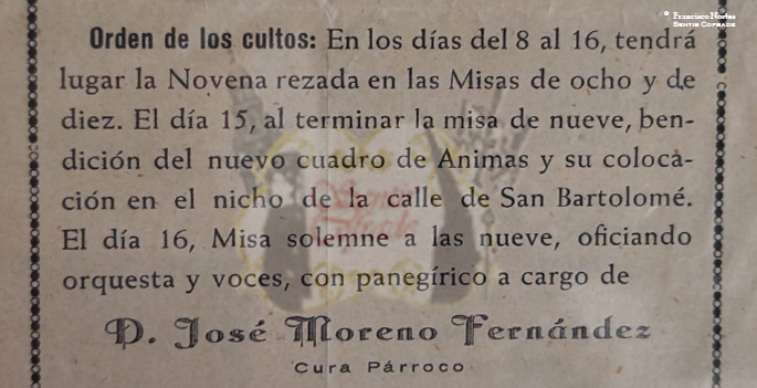 «El día 15, al terminar la misa de nueve, bendición del nuevo cuadro de Ánimas y su colocación en el nicho de la calle de San Bartolomé»