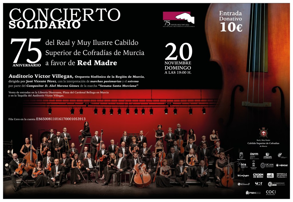 Como de costumbre el Cabildo Superior de Cofradías de la Semana Santa de Murcia organiza su anual Concierto Solidario. En esta edición está enmarcado en las celebraciones del 75 aniversario de la creación del propio organismo que agrupa a todas las Cofradías y Hermandades de Pasión de la capital murciana.