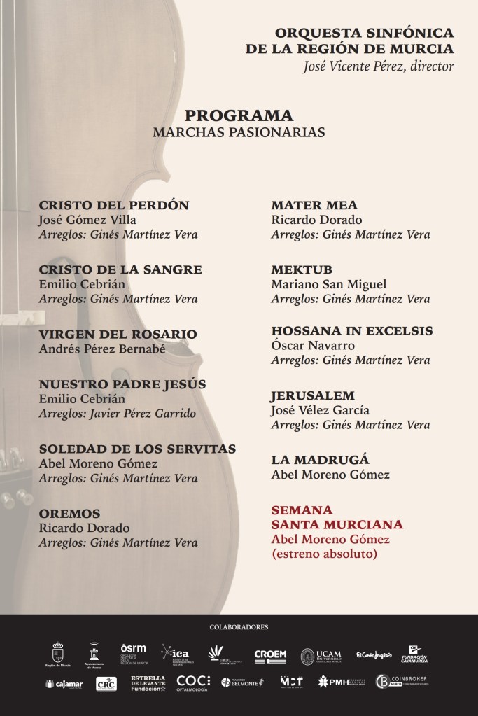 La Orquesta Sinfónica de la Región de Murcia será la encargada de interpretar un total de 12 marchas de procesión, destacando el nuevo estreno: Semana Santa Murciana, obra de Abel Moreno Gómez.