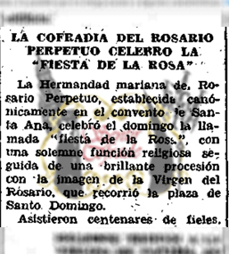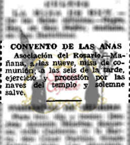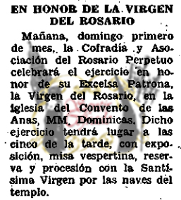 celebrará el ejercicio en honor de su Excelsa Patrona, la Virgen del Rosario, en la iglesia del Convento de las Anas, MM. Dominicas. Dicho ejercicio tendrá lugar a las cinco de la tarde, con exposición, misa vespertina, reserva y procesión con la Santísima Virgen por las naves del templo.»