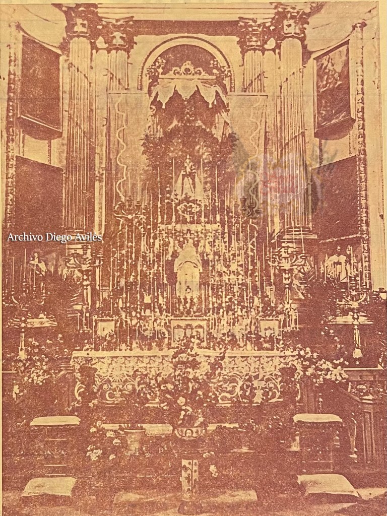Si curioso es el testimonio con tintes cineastas que nos deja su aparición en «la Alegría de la Huerta» no lo es menos esta foto que compartió con nosotros su acual propietario, Diego Avilés Correas. Se trata de una fotografía del interior de San Antolín, antes de la Guerra Civil, en donde podemos admirar la belleza del propio templo y la suntuosidad del efímero altar presidido por la Virgen de la Fuensanta sanantolinera. El reverso de la foto dice así: «Entre centenares de cirios encendidos, de bombillas multicolores, de arcos triunfales hechos de mirto y laurel, sobre una auténtica montaña de flores criadas en los huertos de la buena gente de San Antolín, han colocado a la Madre de todos, a la Fuensantica. Macetas de hortensias y palmeras alfombran el suelo del altar. Es Mayo, el mes de las flores: y los sanantolineros han hecho un jardín en el altar mayor de su Iglesia, un jardín, más que de flores, de amor, de cariño, de ilusión».