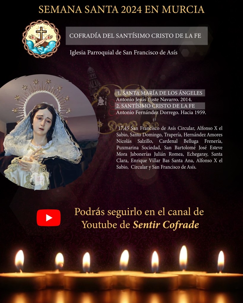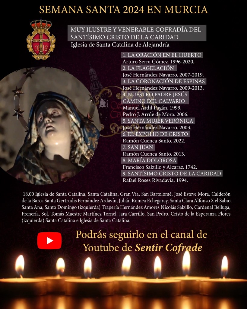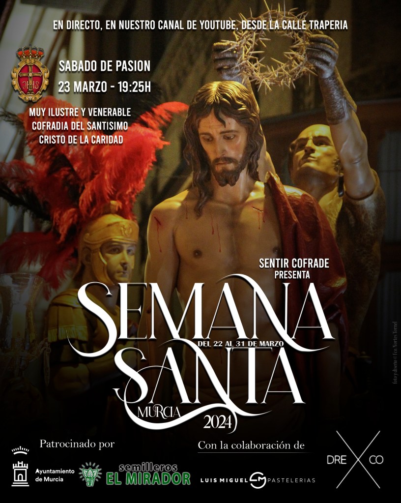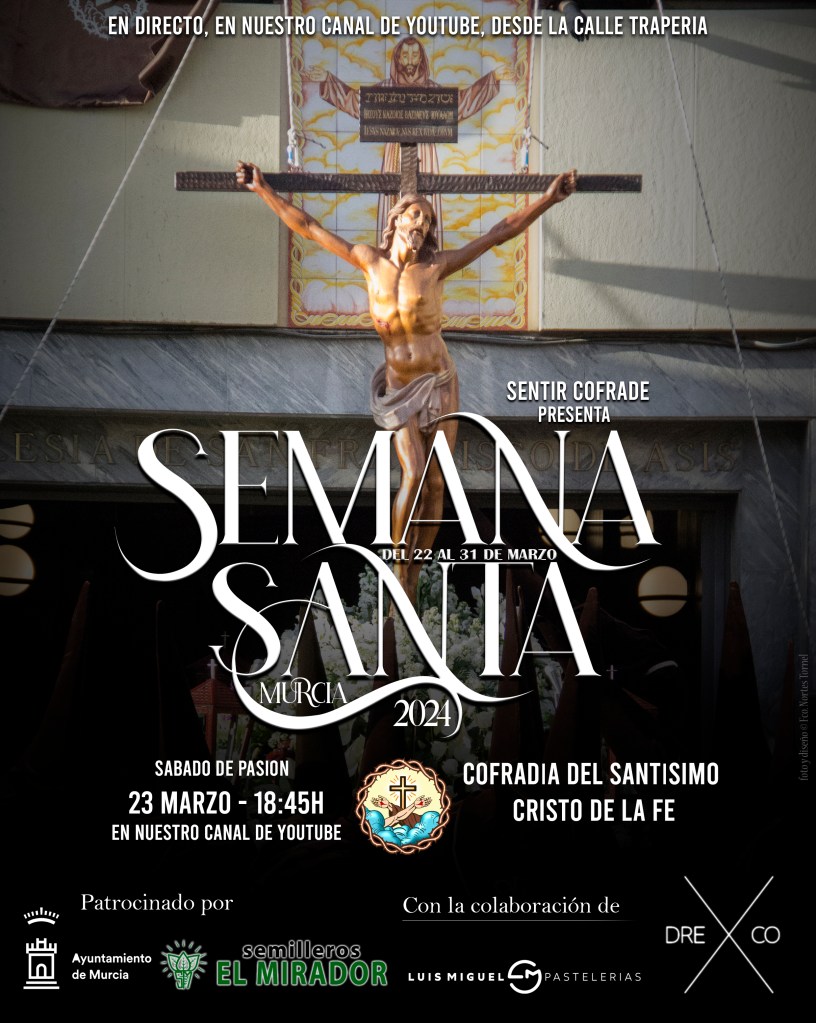 Segunda entrega de nuestras retransmisiones en la Semana Santa 2024 de Murcia. Hoy es el turno de dos de las Cofradías de Pasión más jóvenes. Desde las 18:45h contemplaremos el discurrir de la procesión del Cristo de la Fe, que este año celebra sus bodas de plata. Tras el cortejo de los cofrades «capuchinos», antes de que llegue la Caridad, disfrutaremos del Nazareno de la Merced en su traslado a San Juan de Dios. Una vez hayan pasado los cofrades de la Salud con Nuestro Padre Jesús, comenzará el desfile de la Caridad.